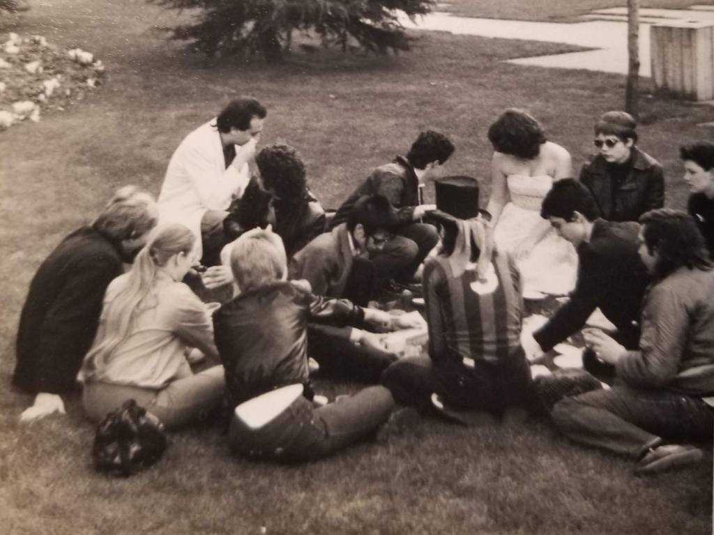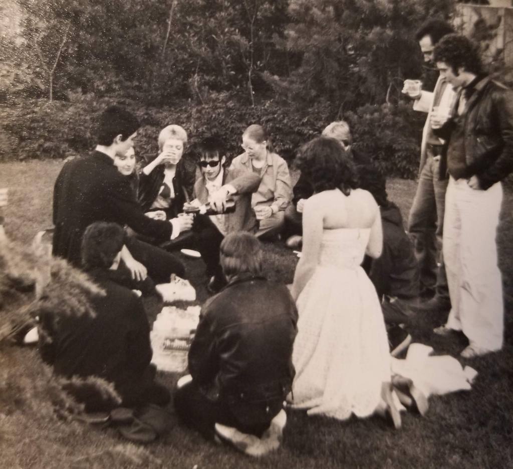 It was to be a small, informal affair, starting with getting the marriage license. Then we booked a courthouse date & told some friends. The judge that officiated must’ve found it odd that upon the completion of our vows we faced each other & shook hands. The 2 witnesses were friends of mine, so they merely giggled. 14 people, including the bride & groom & whoever took the photos (I don’t remember who this was, & since they weren’t in any of the pics I’ll never know), attended the reception. Who doesn’t like a sham marriage for a reason to party? It was held as a picnic at Freeway Park, with cake & champagne, & possibly gifts but I can’t really say. When I look at the photos now, I’m amazed my sister invited 3 of her boyfriends! Like Scrooge’s ghosts: boyfriends past, present, & future.